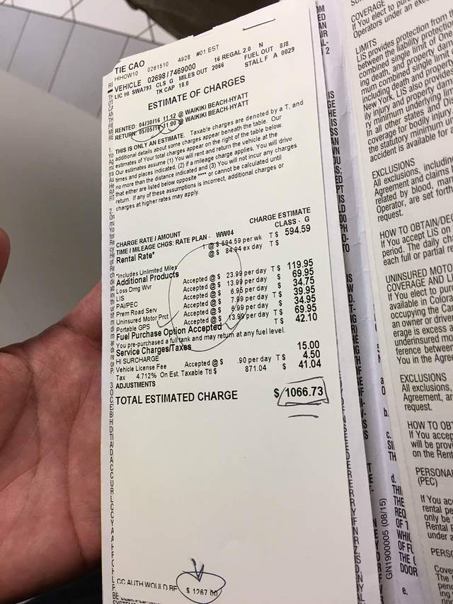 各项费用汇总,五天最后总费用是1066.73美金。夏威夷租车算是比较贵了,高于美国本土很多地方。