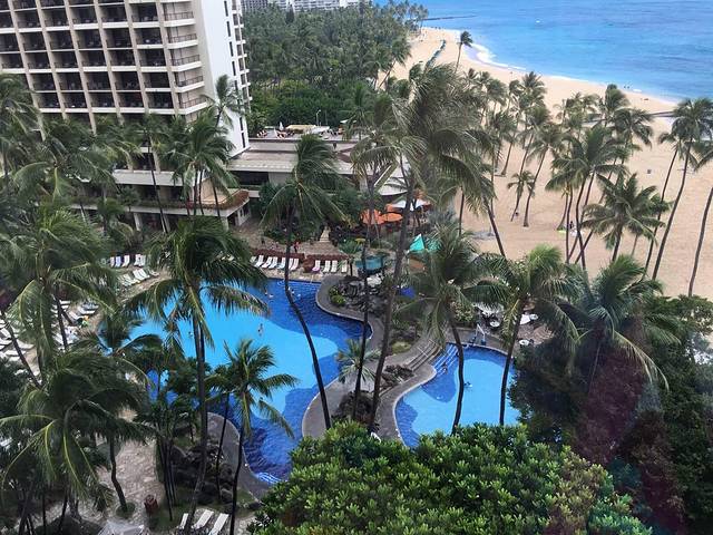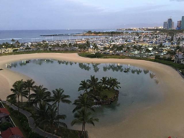 我们在网上预订的彩虹楼的海景房,7晚总共15431元。另外到酒店后每晚要多付30美金的度假村税,相当于每晚2400多人民币的房费。之所以选择彩虹楼,是因为它距离威基基海滩最近,风景最好,海景房从阳台望出去能同时看到泻湖美景和海景。