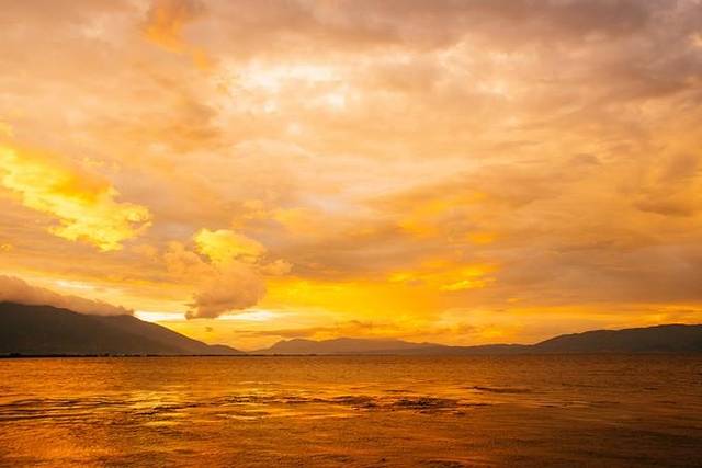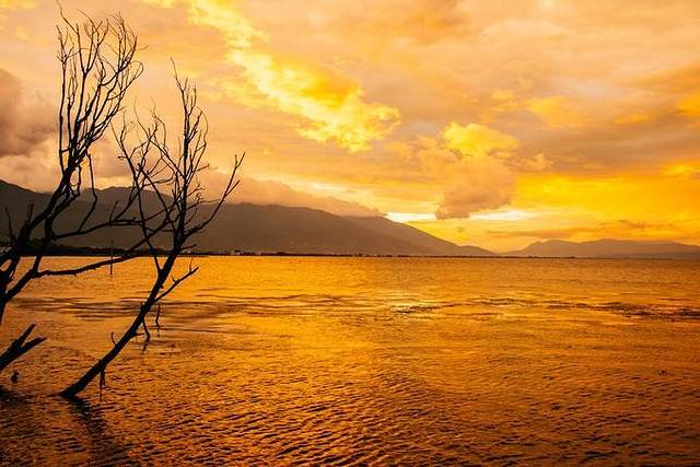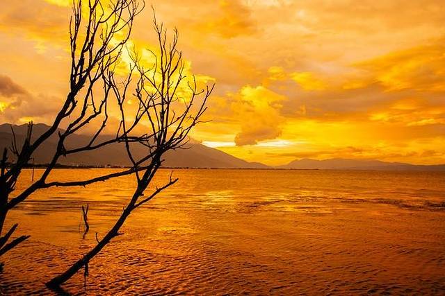 洱海夕照,枯树的剪影映衬夕阳下的洱海,太棒了
