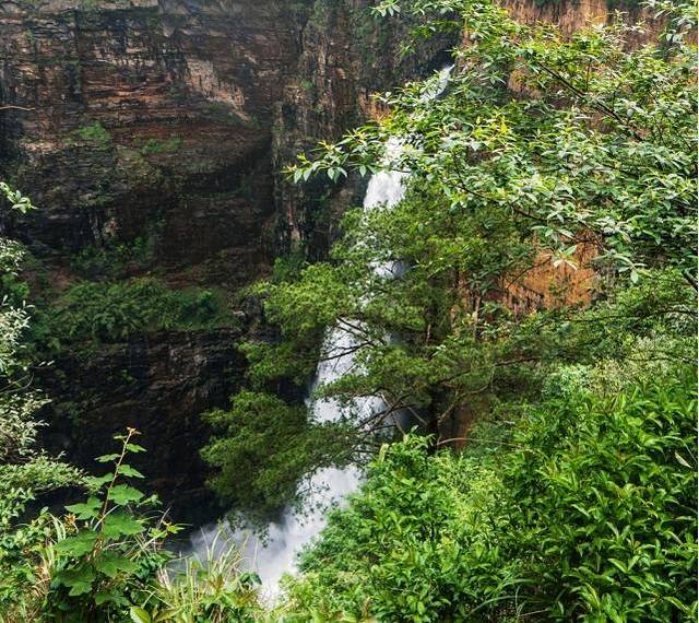 腾龙大瀑布区大的水花,远看是一层烟雾,背对阳光下成了彩虹。第二观景台看到的。