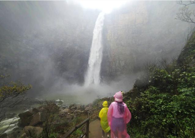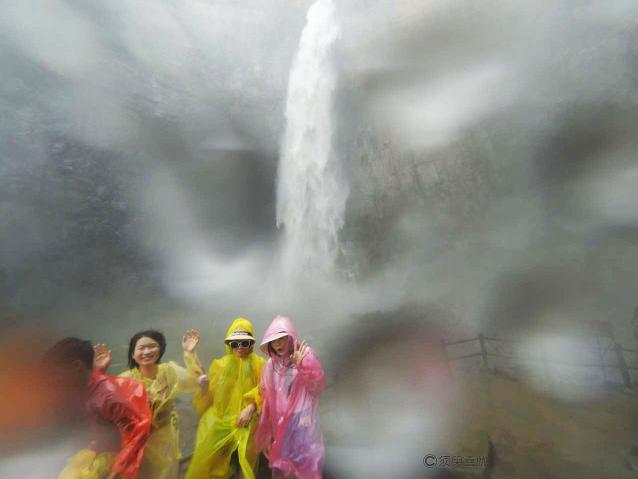 腾龙瀑布之下,飞溅四起的水花,让人感觉就在水中畅游的感觉,雨伞与雨衣都无法招架,手机、相片也无用武之地,此为小米运动相机拍摄