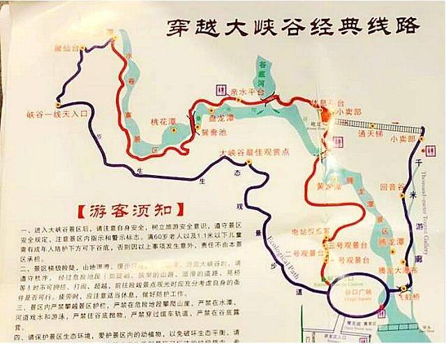生态观景步道→一线天入口→一线天景区→亲水平台→腾龙潭→电站展览室→三号观景台→二号观景台→谷口广场