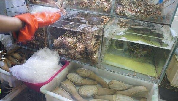 天下客海鲜店门口有一个大大的海鲜缸,里而的海鲜品种还是非常齐全,价格也很实惠!