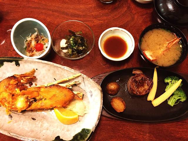 整个套餐。媳妇吃第一口龙虾就惊了,连说好吃,又续点了两份伊势龙虾。料理名叫:いせエビうに風味。不过媳妇吃过两份龙虾后就说吃恶心了。