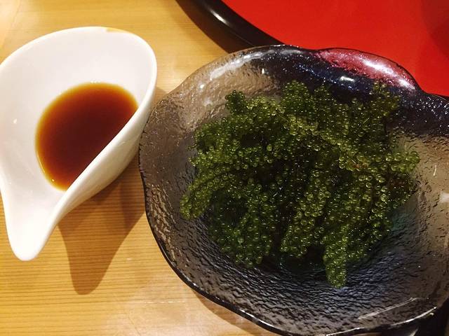 海葡萄,一种海藻,没想到最后在机场的餐厅吃到。配上油醋汁还行。很爽口!