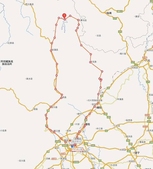 成都——松潘——九寨沟——平武——北川——江油——绵阳——成都