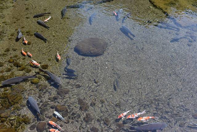 清澈的泉水倒映着绿意盎然的精致园景、池中的锦鲤悠然地徜徉其中、清新而宁静。池周还有售卖鱼食的小店,可以买上一包喂喂小鱼,感受和自然的亲近。