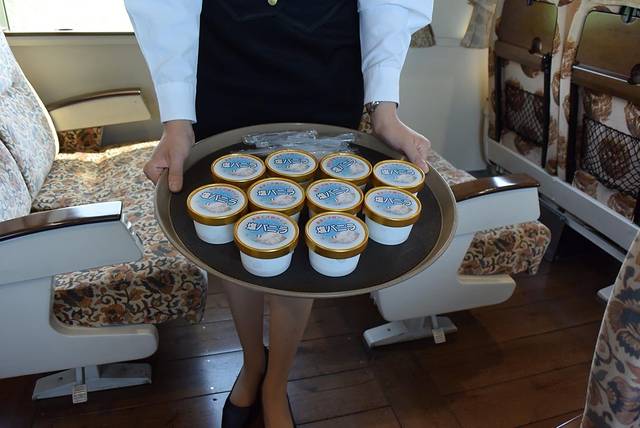 列车上,相貌甜美的乘务员端着一盘盐味香草冰淇淋向车内的乘客售卖。香甜的香草冰淇淋,搭配富含矿物质的天草盐,咸甜均衡,更加爽口解热。