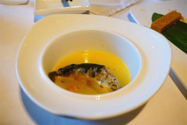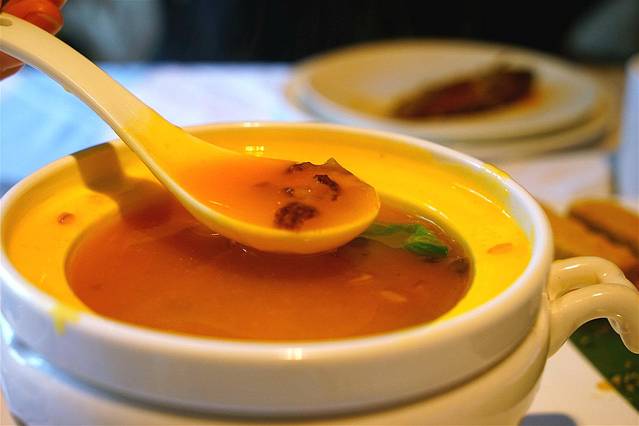 小巴鱼:据说小巴鱼长大后就是河豚,如果未杀之前,你用手指戳它的肚子会涨起来,像一个大肚子鱼。这条小巴鱼是炖汤,小小一盅,汤汁乳白色,撒上点胡椒粉或者滴几滴镇江醋,趁热喝,那个鲜美啊打你耳光也不会吐出来,喜欢清淡以追求自然食材的鲜美的朋友一定要点这道菜。