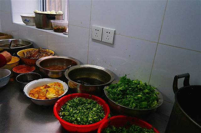 价格贴在墙上,桌上摆满了料,这里是付钱给浇头的地方,有负责给碗内加浇头的阿姨,自己拿着加好浇头的碗去到外面煮面地方,并把碗给煮面阿姨,和煮面阿姨说面要什么类型面(细面、宽面、小刀面)。