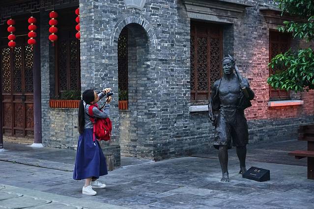 美女拍摄姿态可爱认真,仿佛在收纳历史人物的历程。