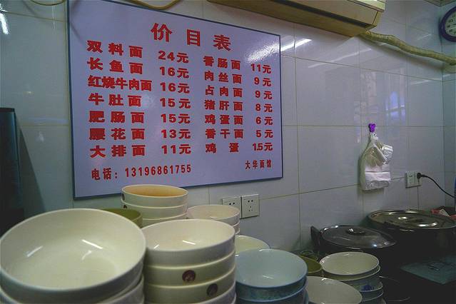 进去看感觉店堂更像六七十年代家里布置,墙上挂着几幅画,店内摆放着五桌四方桌子,凳子也是长板凳,每桌都有当地人用餐,而且感觉当地人生活很悠闲的,也不是急匆匆吃完就走的那种,我们看了一下门口的菜单,又经老板娘介绍一直决定点一碗荤的全家福锅盖面28元、蔬什锦菜包1.5元。没有想到端上来时候是一大碗,那个碗也是上世纪的蓝花瓷碗,这一碗应该是四个小胃口人的分量,三个吃货差点把面汤全部都倒进肚子,还好我反应快,否则下一个大华面馆就无法品尝了。意外的品尝大家一致觉得这锅盖面好吃,就连哦对面食很挑剔的人也认同,口碑精髓不忘初心,这是最难得的。