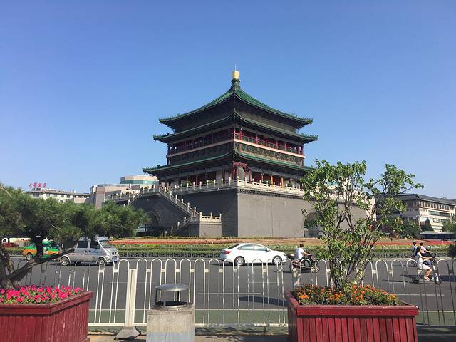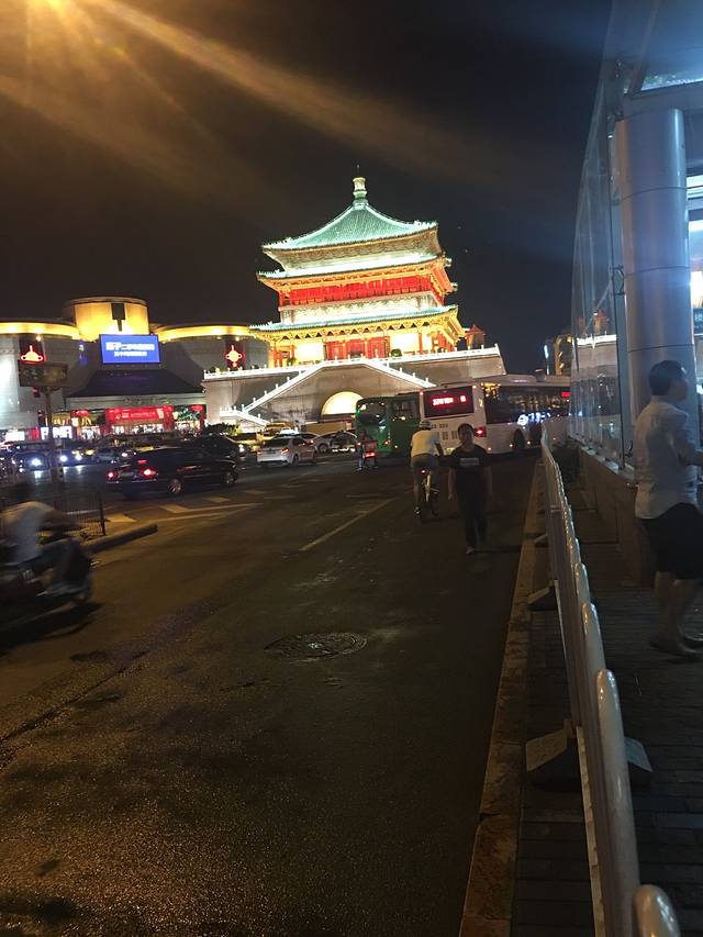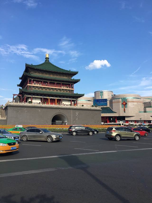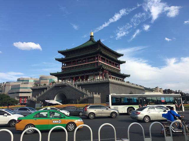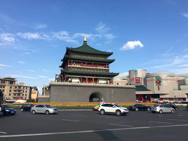 从公寓出来,门口就有公交站,看了一下没有到大雁塔方向的公交车,往前走200米就看到钟楼了,经过钟楼,忍不住拍了张,发到朋友圈表示已到西安。顺着路右转走100多米就到了公交站了。在公交上征求两个孩子的意见去哪里,他们想去大雁塔!