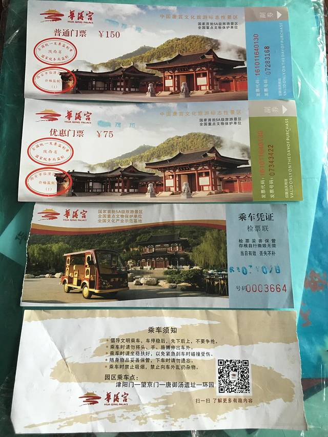 继续吐槽,5A级,华清池和骊山通票,不能单买,有没有考虑过不想爬山游客的感受?150块大洋啊!华清池不大两小时足够逛完,一些浴池遗址和上面后建的宫殿、园林。最坑的是坐电动车逛,16元一个人,两个孩子只收了一个人,我们四个人48元,开几步就下来照相,也没有讲点什么,纯粹送钱。一般开电动车司机就是推销《长恨歌》,好多网友通过他们买的票,因为带着孩子没有兴致看,最后没有看,听说很震撼!强烈建议不要坐电动车逛!