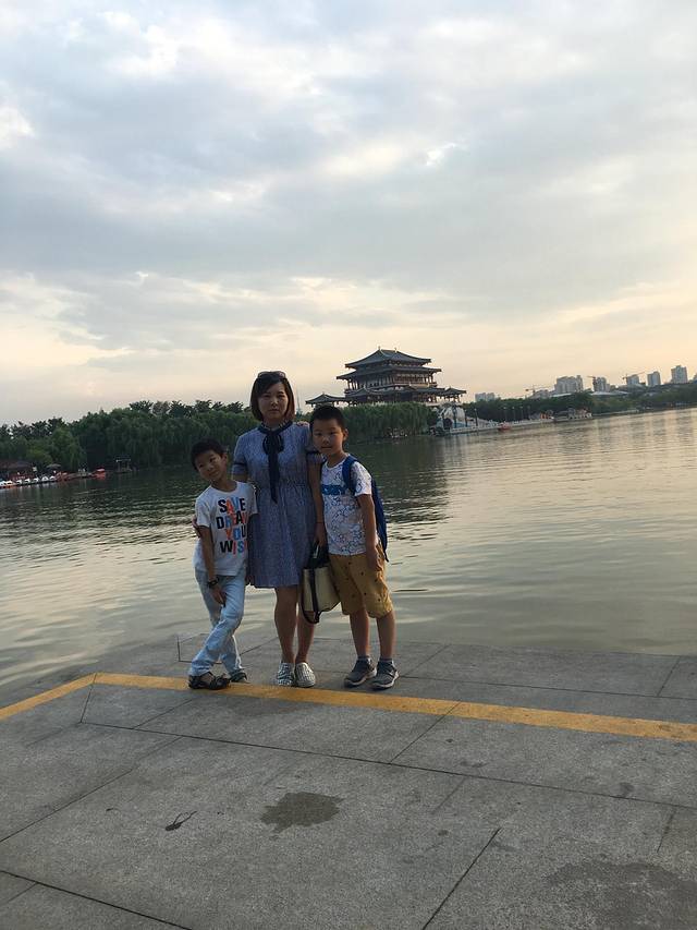 从地铁2号线钟楼站A出口出来,向左边走大概100百米就到了,宏府嘉会公寓,类似写字楼形式。在这里不得吐槽一下,我们出地铁后向左走到北大街,感觉不对,我和韩同学妈妈打了几个电话才知道了位置,往回走100多米,找到公寓入口,按酒店上的地址上找到11楼,找了一圈也没找到,又打电话,才知道说是搬到10楼,真是坑啊!我们又下到10楼,又找了一圈没标志,又打电话,老板这时候才出现了。一块石头落地了,总算是找到了,到老板办公室办理好入住,两个大人的身份证都要,大概20分钟才弄好,老板带我们来到我们定的房间在7楼,比较宽敞,两个大床,不是并排在一起的,一个头朝东,一个头朝南,空调正对着朝南1.5米床,就是我和屈同学的床,韩同学他们选的1.8米朝东的床。老板详情说了热水器怎么用,到回民街往后面电梯下,顺着白色楼房走到头左转就很快到了。并且电费我们要自己出,带我去看了电表底数,收了100元押金。咨询了一下老板去大雁塔怎么坐车?他建议我们先去逛大唐芙蓉园,回来再看大雁塔北广场的9点钟音乐喷泉。我们简单收拾了一下,差不多4点了,带上水背上背包,准备我们西安行的第一站大雁塔、芙蓉园!