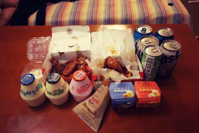 第一晚的宵夜 TwoTwo炸鸡 啤酒 饮料 香蕉牛奶 叫兽布丁 咖啡牛奶