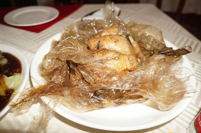 没错!叫化鸡!两个人一只鸡神马的,其实鸡不大啦~