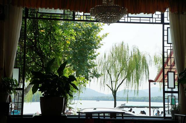 楼外楼窗外的景色,应该2楼景色更好。最靠窗的位置,一桌的最低消费是1500,没事啦,我们一样风景很好。