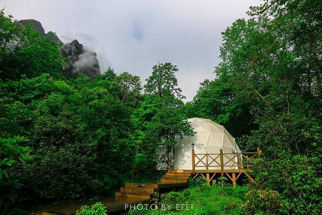燕子沟的特色酒店——气泡酒店,白色的遮光罩在夜晚的时候可以打开,躺在床上便可以欣赏雪山和满天的繁星。想想都很浪漫啊。
