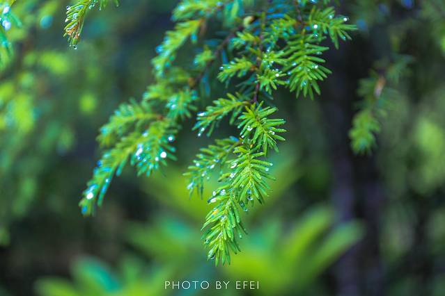 森林里的植物上因为晚上下过雨,枝头上泛着点点水光