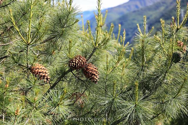 山上高大的松树上结的巨大的松果。