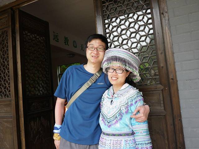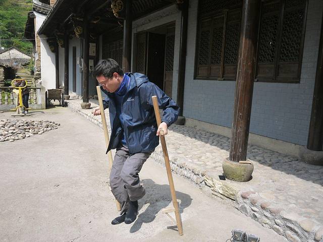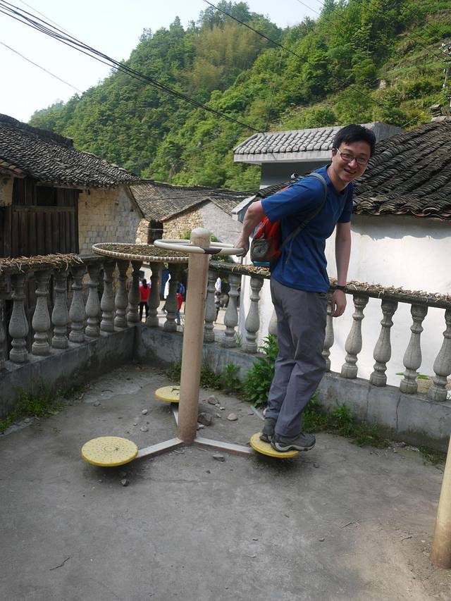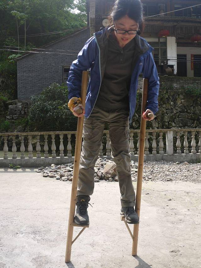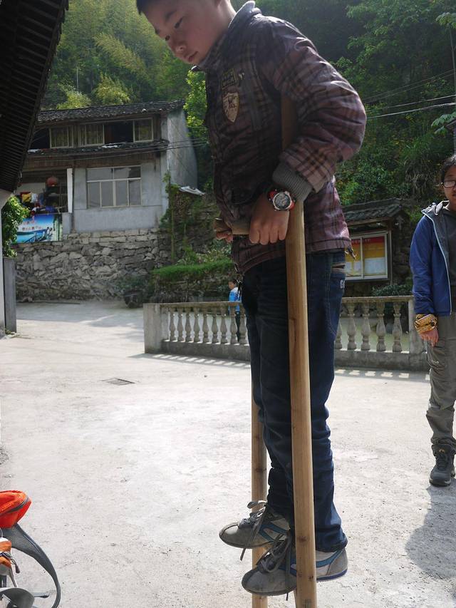 外婆坑很小,十分钟就能逛完。为了留住游客,他们就想起了那些少数民族媳妇,组织她们跳个舞啊,其实节目很乡土,跳的基本就是广场舞的节奏了。不过不能阻止我们穿穿民族服饰的劲头。农家的小孩和我们聊了几句后,兴致勃勃的拿出高跷,让我们学习。我一学就会,可怜老公踩着高跷像某残障人士刚刚迈出复健的第一步……