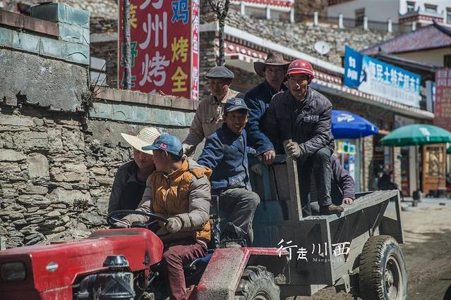 快到四姑娘山的山脚下,有一路段正在修路,停车的这段时间,偷拍下当地的人文,这辆农用拖拉机上,居然坐满了六个汉子。