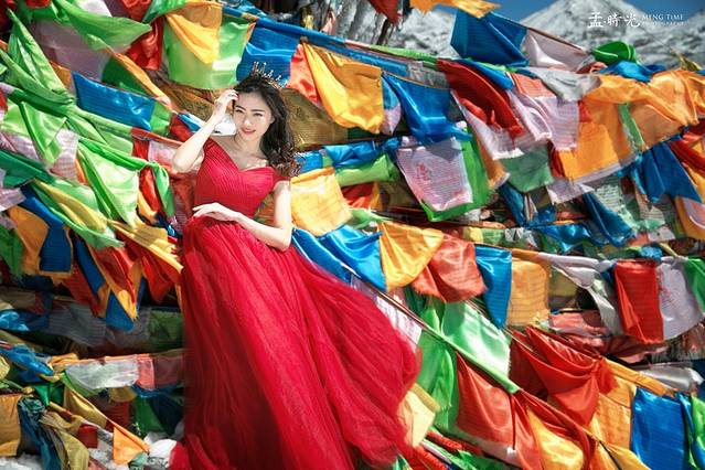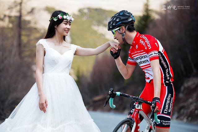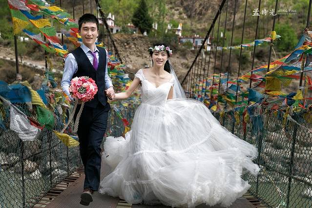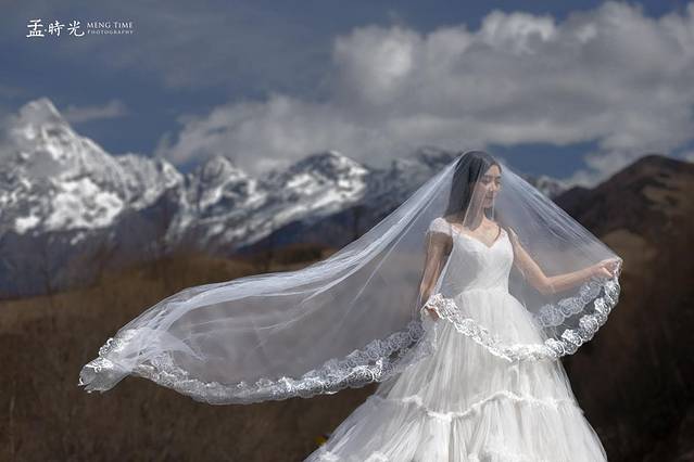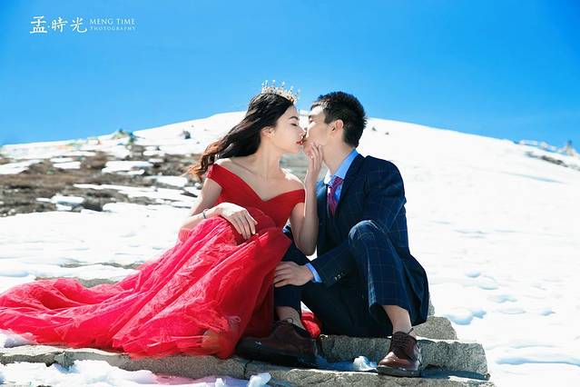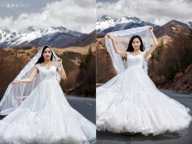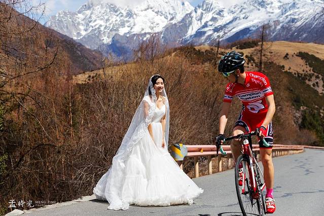 下到半山腰来,桂圆和小高已经着装完毕,我们也别顾拍好景啦,耽误了给桂圆拍婚纱照的正经事。带着婚纱去旅行,这是越来越多年轻人的个性选择,在如此风景的雪山脚下拍婚纱照,不也快哉!