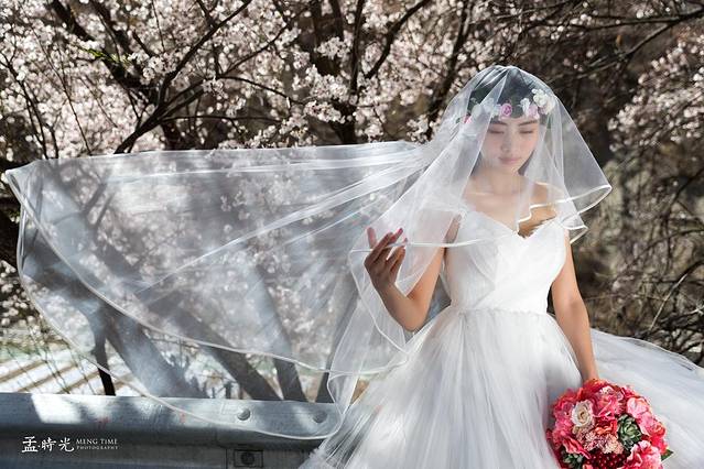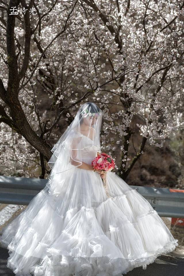 路边桃花下的新娘,在蓝天的映衬下也更显娇艳……