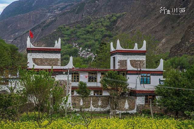 某藏民家一院落,里边种满了油菜花,梨花,停车下来,欣赏白黄相间的春季美景。