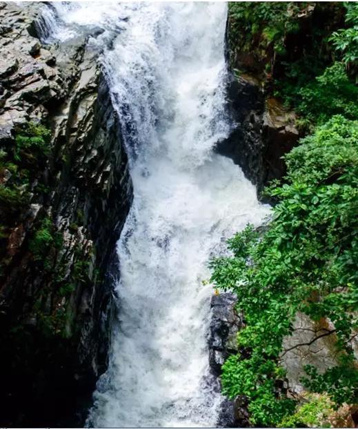 那横亘的铁桥是俯瞰谷底的好地方,走在上面看脚下瀑布飞下,心惊胆战。俯瞰谷底,层恋叠翠,蓊蓊郁郁。