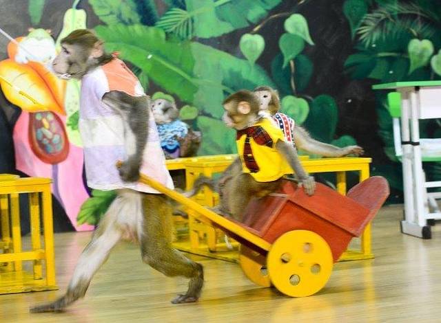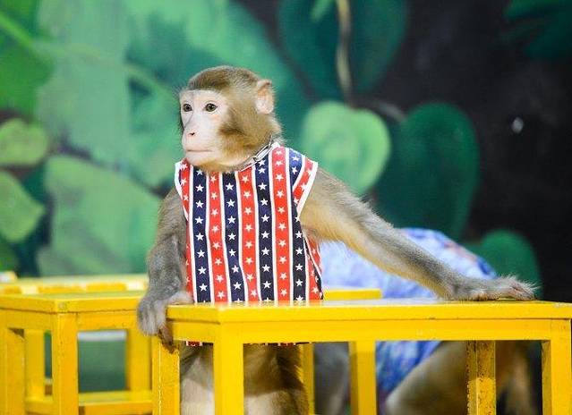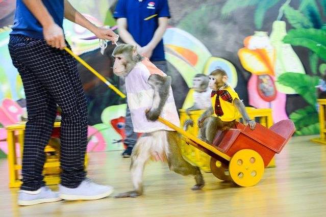 7只乖巧聪明的猕猴在专业调教师的带领下,有模有样地进行环保课、礼仪教育课、体育课、才艺课等特色表演,引得现场观众捧腹大笑、掌声不断。