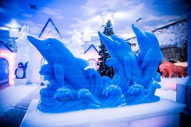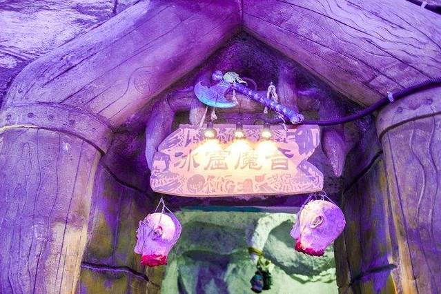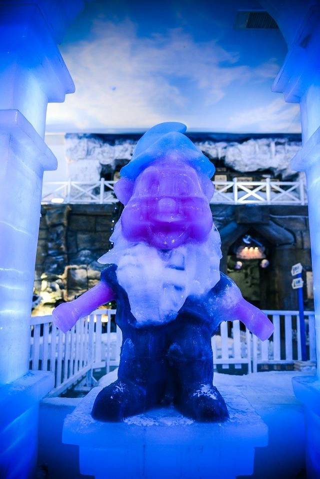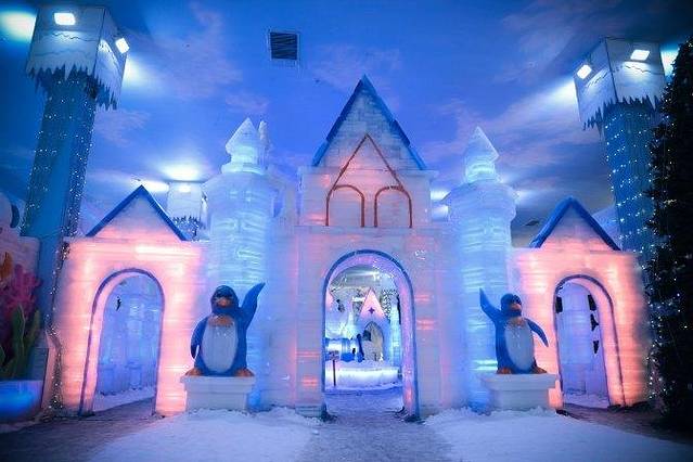 一走进冰雪世界的大门,仿佛穿越到了寒冷的冬季,一组组大型的冰雕加上梦幻的灯光如同走进了一个冰雪的童话世界。