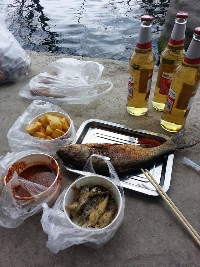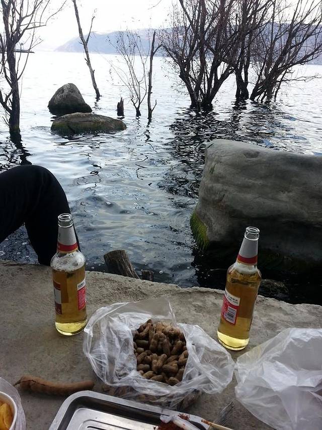 这次直接骑到了昨天的烤鱼摊,跟着李哥又吃了一遍,简直给po主幸福的不行~~我们直接把家伙都带到了洱海边,海景烤鱼不能再赞。洋芋和啤酒,感谢这多出来的一天~~可怜基友只能看着我们仨吃。。