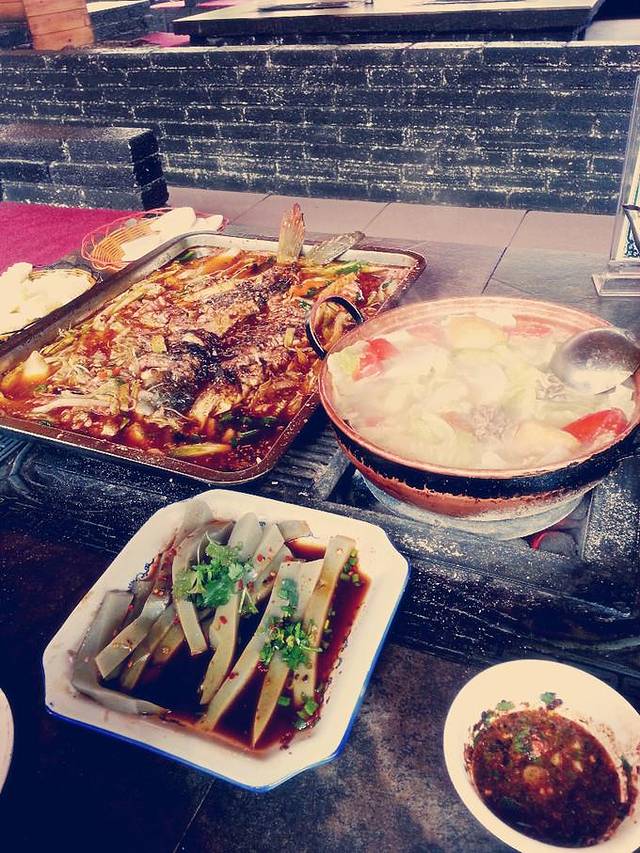 我们搭公交原路返回旅游学院。因为行程问题在丽江又多逗留了几天,正好老王考完试,就又请我们去吃饭。趁着大批的学生还没出来,我们去了学校附近的一家【泡菜鱼】店。一整条鱼是用盆装的,鱼肉以外有汤的地方都铺满了辣椒,三斤多的鱼70多块,比家里这边实在便宜太多!