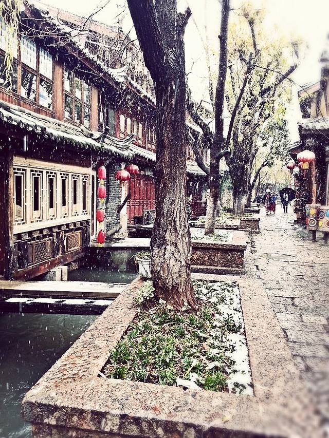 又是天还没亮,早早就起了床几乎把能穿的都穿上了,一身厚厚的装备准备去雪山。刚出客栈发现丽江竟然下起了雪!纷纷扬扬,抬头一看,原本乌黑的瓦片全都换了颜色。