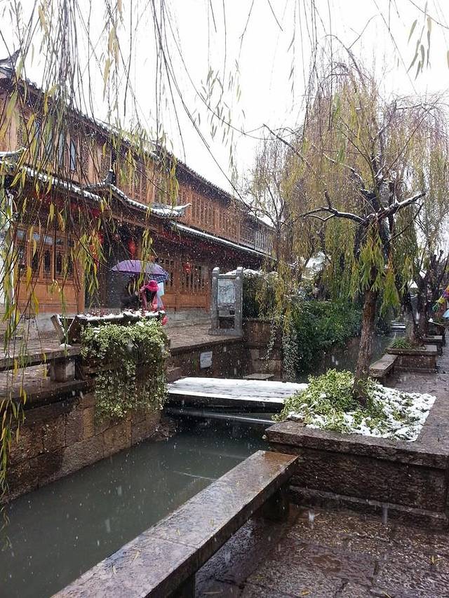 雪山之行取消,我们打道回古城闲逛。下雪的古城也是极美的,完全不同于北方。红花,绿树和黑瓦配白雪,完全不同于我看了二十多年的雪景。乌黑的石板路被雪水冲的油亮亮,从天到地,煞是好看。