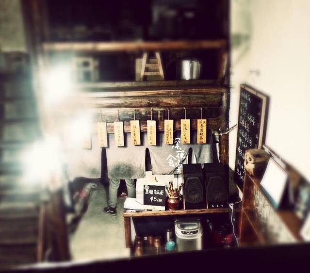 客栈房间外景色不错~老板在那个白色的伞下面干活,只露出来两条腿- -
