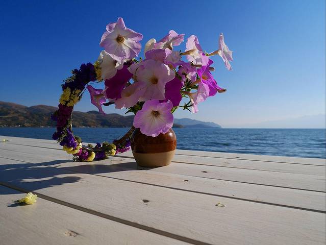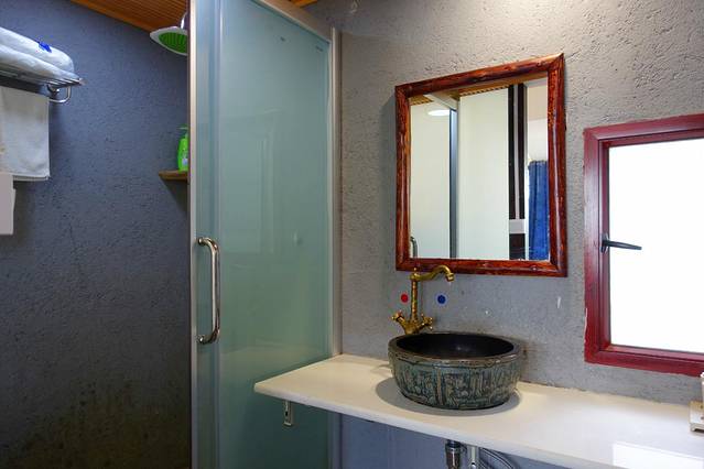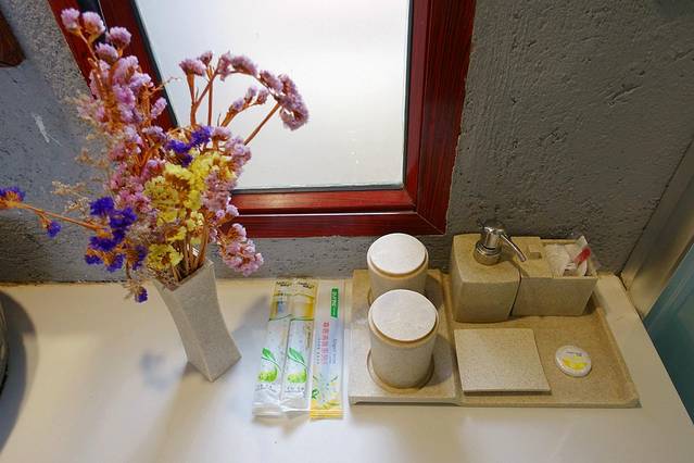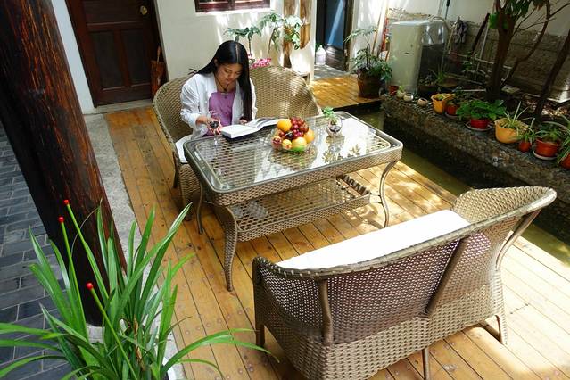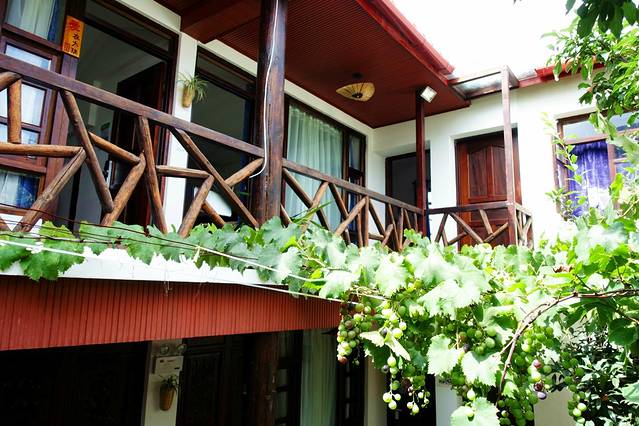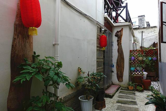 一间豪华标间,宝宝和我睡,爸爸自己睡。房间虽小但是很温馨,一家人住正合适,放了行李后,出去才发现,客栈里还有个这么漂亮的院子,简单不失设计,花盆里的花门开得正盛,冒出一阵阵的香气。