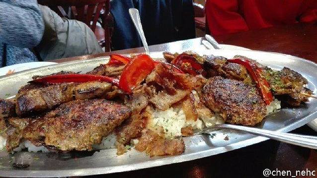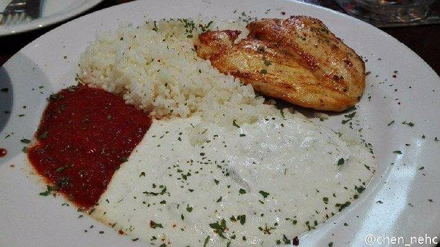 还有一个火鸡排,那个酱料很有特点,是蜜糖味的辣椒酱和青瓜味的酸奶酱。因为土耳其菜的米饭都是调味的,所以主食全部要了米饭,这家餐馆用了黄油和盐,一些餐馆还会加入坚果。