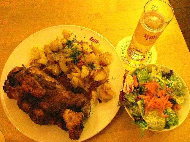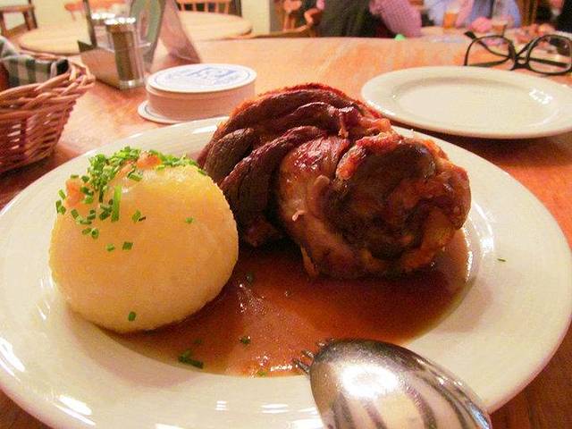 主菜当然就是烤猪肘Schweinshaxe啊!这个猪肘烤得不会老,很香脆。吃完一个还是意犹未尽啊!主食那个黄色的球是kartoffelknödel,是德国一种传统食物。这个食物是这样由来的,在以前资源匮乏的时候,人们没有足够的食物,所以把没吃完的面包和马铃薯打在一起,可以继续下餐食用,慢慢地,这可发展成为德国一道著名的主食。各家做得口味不一样,有些像土豆糯米球,有些一切下去就像水煮面包,不过,无论怎样,还是值得一试的=D