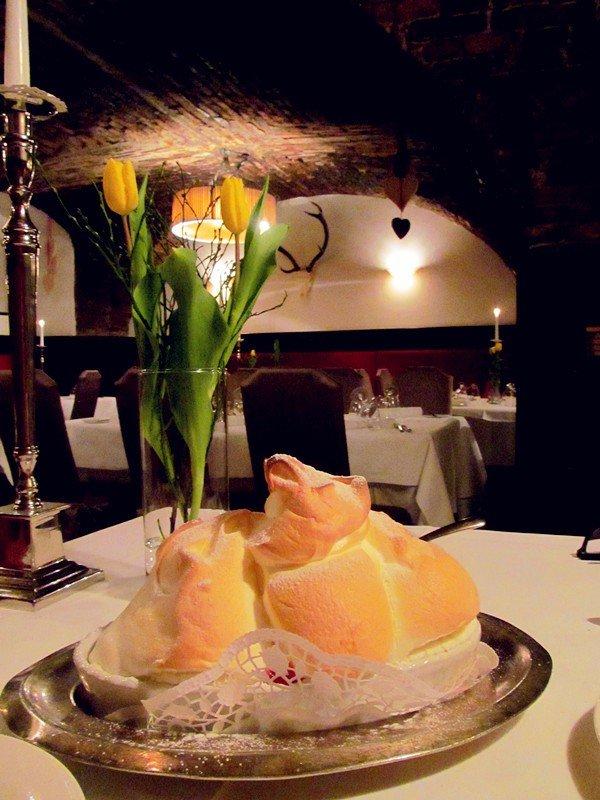 甜点是Salzburger Nockerl,就是焗蛋白,淋上Himmberry Cream。味道就如中国菜餐厅里面的舒芙蕾,但是有自己的特色,分量很大,应该可以3-4人分。