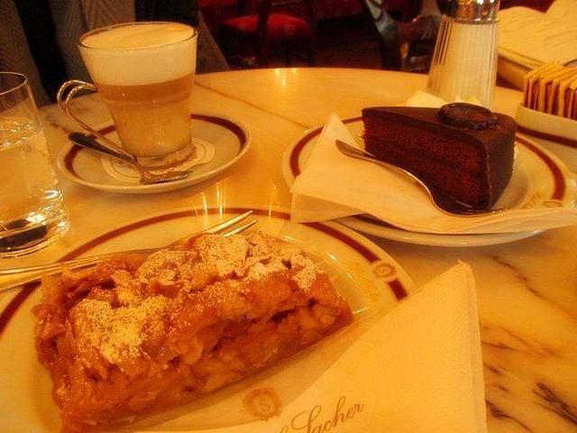 这次我们去的是Sacher酒店在萨尔茨堡的分店品尝的沙河蛋糕。虽说是巧克力蛋糕,但是并不腻。这里比普通咖啡厅略贵一点,但是因为是Sacher Torter的原产地,当然要来试一个我们点了一个Sachertorter要6.5欧,和一个苹果派5欧,再配上个咖啡,我们两个20欧结的账。