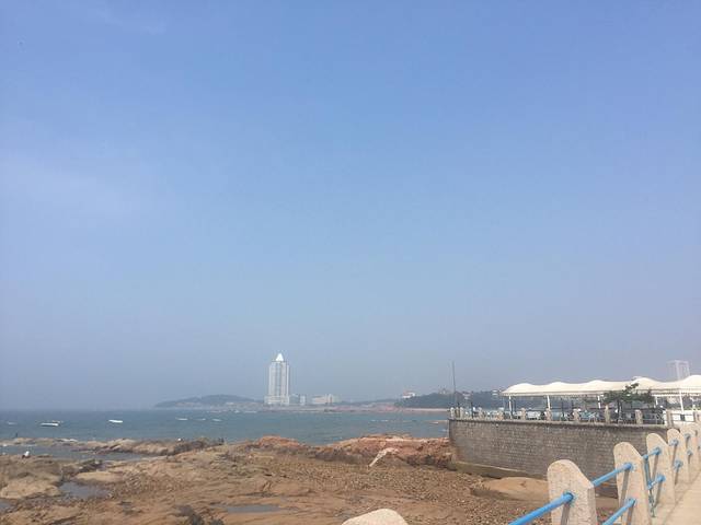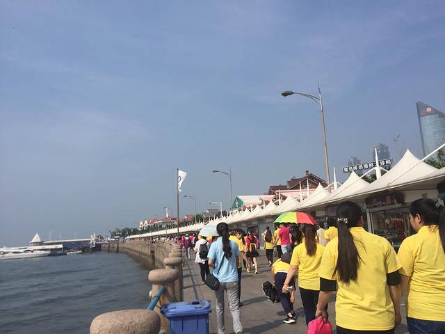 早上经过这里发现有公司在举办健康跑活动,很好奇的我也去围观,当时他们定的路线是从青岛五四广场沿海跑到栈桥,全程7.5公里左右,步行需要1.5-2个小时,反正我也想着沿海走走,就跟在大部队后面奔跑。发现穿的鞋子不对,阳光又太好,风景太美,索性不再跟着大队伍,就沿着他们的路线一个人徒步了起来。