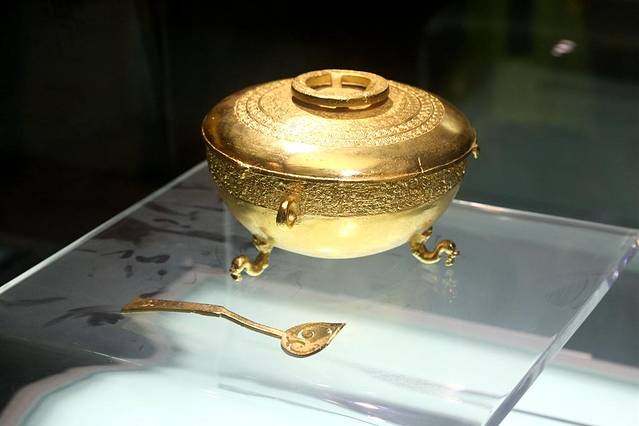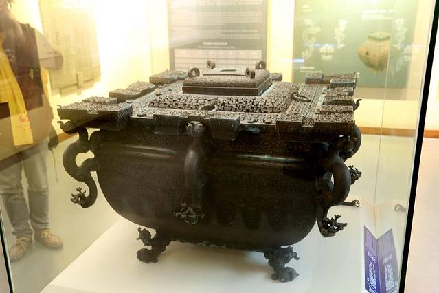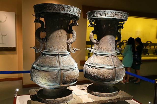 铜鉴缶可以说是古代的冷藏酒柜,在缶内放入酒后,再往鉴与缶之间的空隙内放入冰,这样可以保持住酒的清醇。