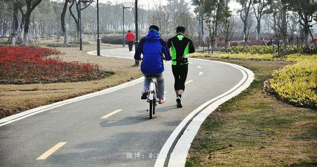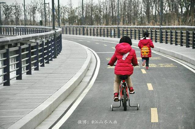 孩子在自行车环湖道上骑行,也很安全的撒点野