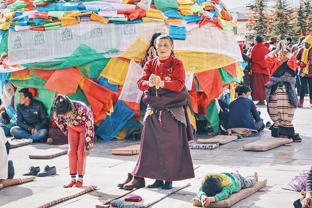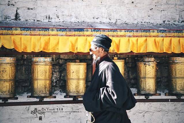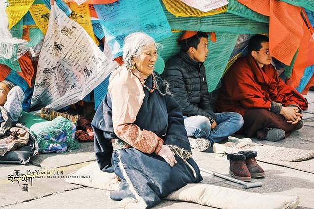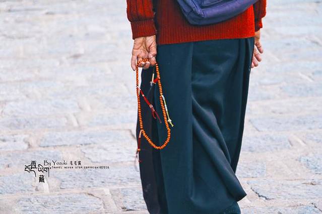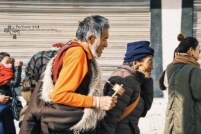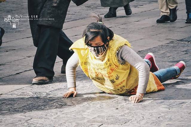 西藏是个很适合拍人文素材的地方,看到那些伏地磕长头或是低头默念经文的藏民,我也会忍不住拿起相机记录,但都会保持一定的距离,并且在一边拍摄。有看见那些摄影师为了更近距离拍摄,直接蹲在他们面前狂按一番,如果因为这样而阻挡了朝圣者的路,是件很让人心痛的事情。他们用身体一步一步丈量土地,朝着心中所向,我们要尊重朝圣者,也是尊重习俗和信仰。