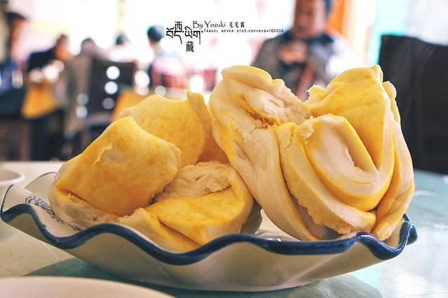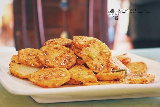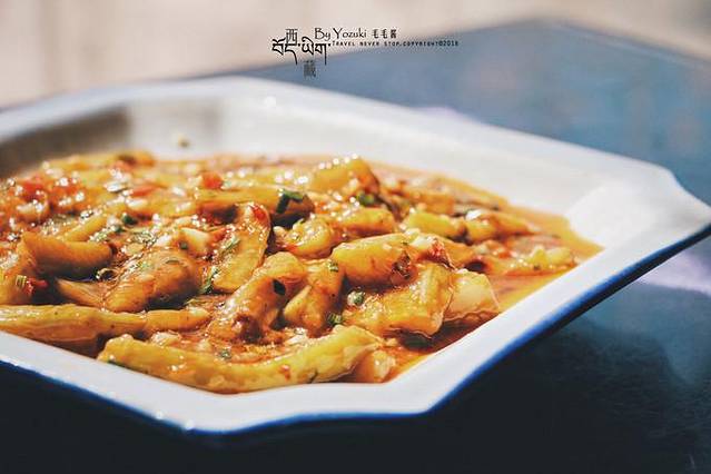 第二天必须改善下口味了,DP上搜到的一家吃大盘鸡和羊肉的店,这里的大盘鸡真的是我见到最大盘的,够5人以上吃了。羊肉作为店里的第二招牌,味道真的做的不错,香辣入味。还有炸土豆片也很好吃,薄薄的一片炸的恰到好处,撒上了孜然粉。我们以馒头代米饭,以茶代酒,庆祝在拉萨。