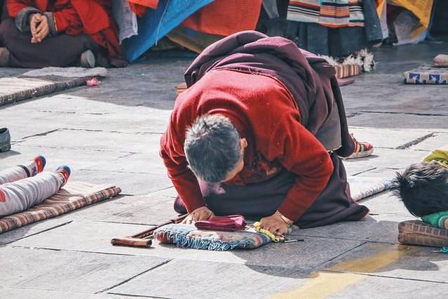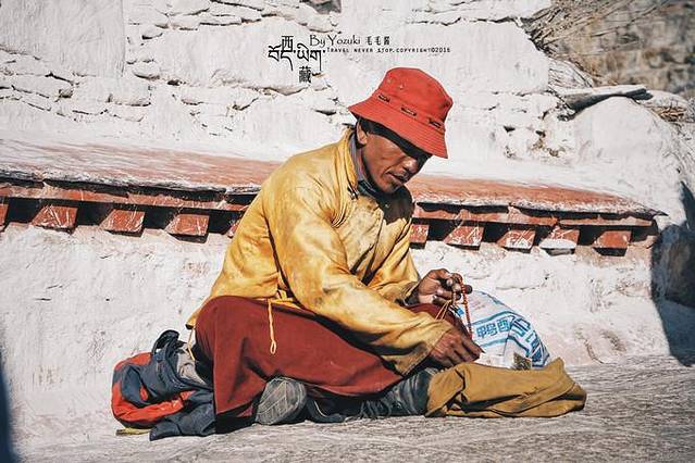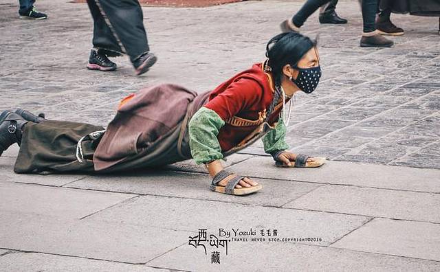 蓬头垢面的七老八十岁长者,还是稚气未脱的束发,手戴木拖板,神情凝重,俯身下去贴近地面默念经文,起身,再俯身,日复一日的如此,只因他们心中有一处最神圣的地方需要到达。我们在公路上驰骋,而他们从数百公里外翻山越岭伏地前进,不知道何时能抵达心中的那座山,或庙宇,并不是每一个人都能到达,也许在路上就断送了生命,同伴会将他们的头发、牙齿,甚至身体的其他部分带在身边,替他们走完朝圣之路。在他们身上,分明可以看到信仰的力量、梦想的坚定、对大自然的敬畏。我们可以不抱有多么大的梦想,但不可以无所事事。