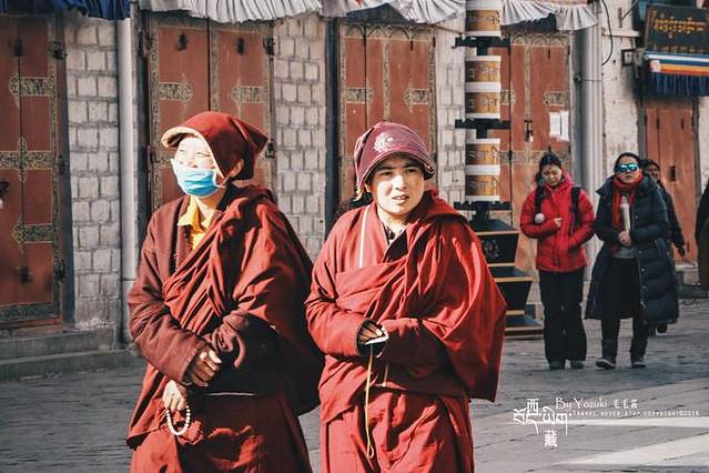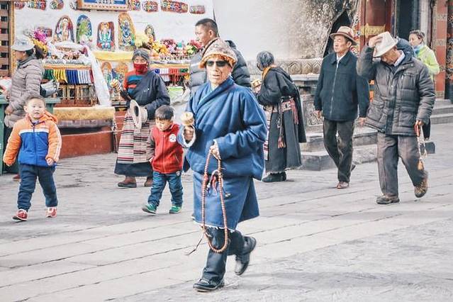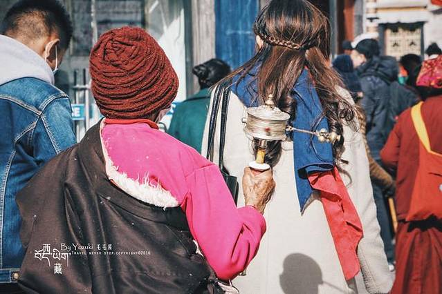 不管老少,总能看见不少藏民手拿转经轮,口中念着经文,转经轮中一般有藏文,耄耋之年的老人可能无法完整地念出经文,那么他们转动转经轮,也等同于诵经。时不时的,也会有穿着红褐色藏袍的市民走过,给大昭寺增添了一抹色彩。